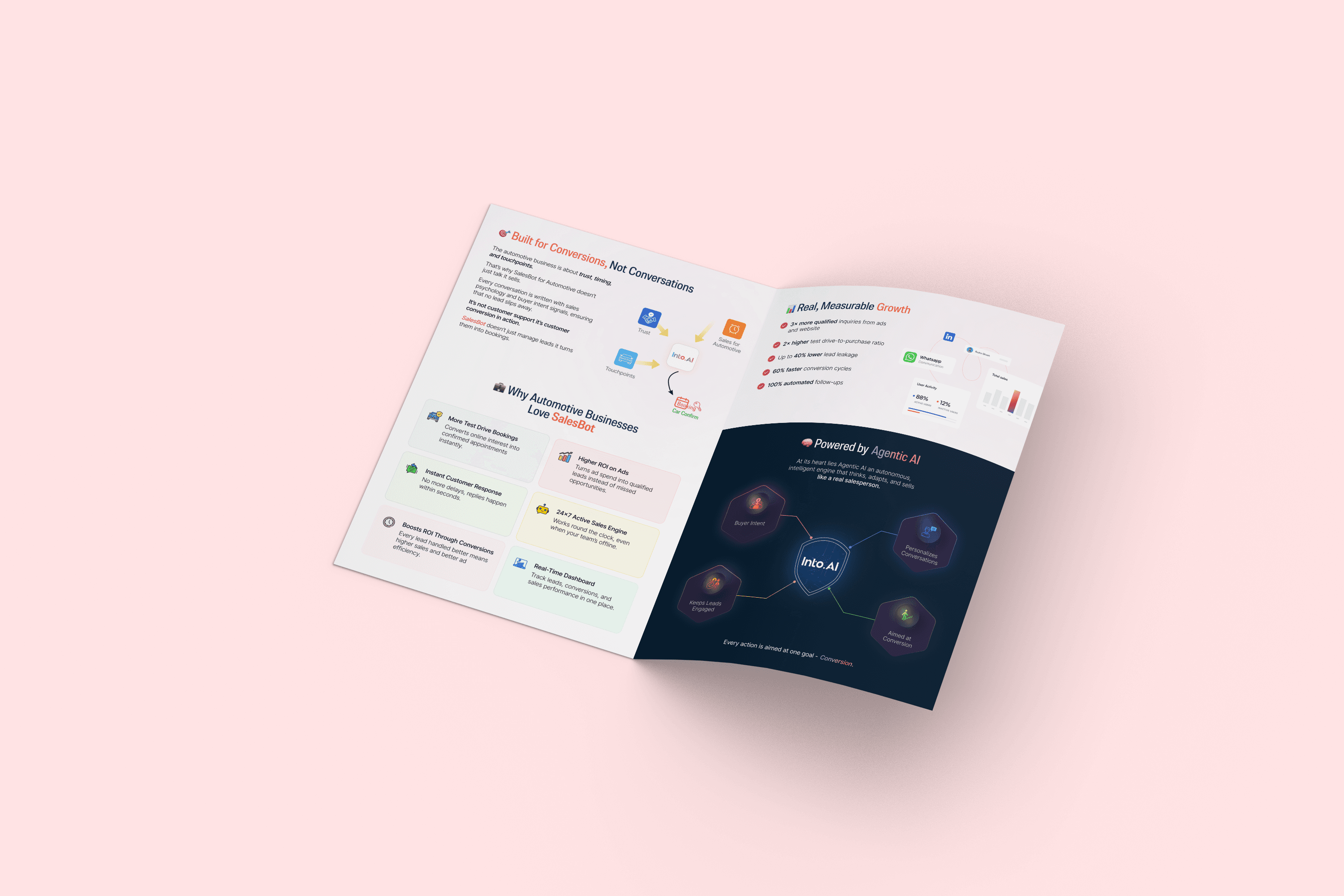Created a bold, premium brochure that simplifies complex AI capabilities into clear visuals and structured narratives. Used dynamic car imagery, clean infographics, and a clear problem–solution flow to explain how SalesBot captures leads, nurtures buyers, and accelerates car bookings in real time.