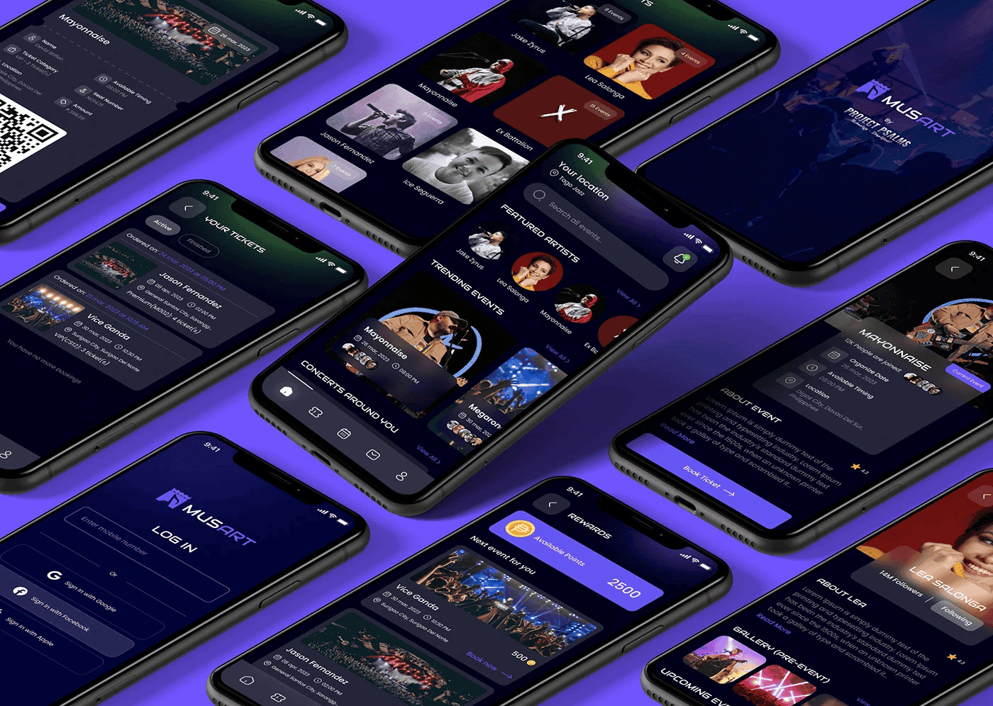 We created a visually engaging UI with clear information hierarchy and simplified flows. Event browsing, seat selection, and payment steps were redesigned with user-focused interactions. Vibrant artwork, consistent typography, and dynamic color accents helped reflect the live music atmosphere while optimizing usability across mobile screens.