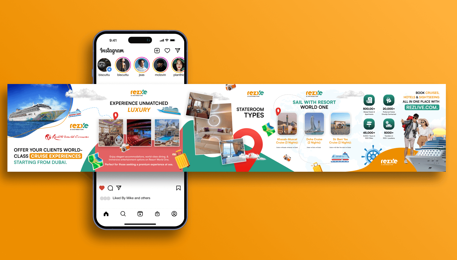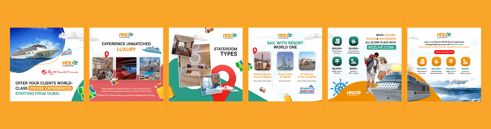 Rezlive is a travel and cruise-focused brand that connects users with premium cruise experiences starting from Dubai. The design was created as a high-impact social media banner to visually communicate luxury travel, world-class cruises, and an easy booking experience — all within a single, scroll-stopping frame.